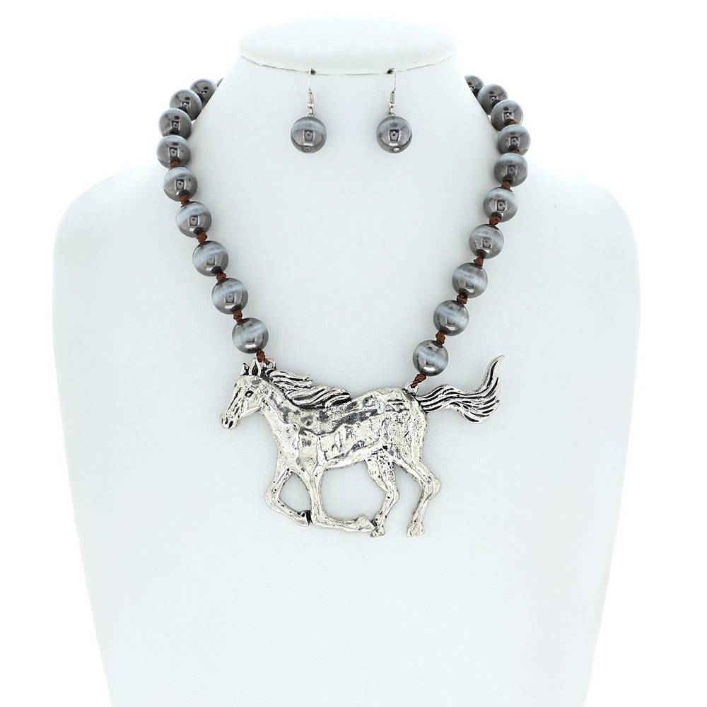 WESTERN METALLIC PEARL CORD BEADED ADJUSTABLE HORSE PENDANT NECKLACE EARRING SET IN OXIDIZED SILVER TONE METAL