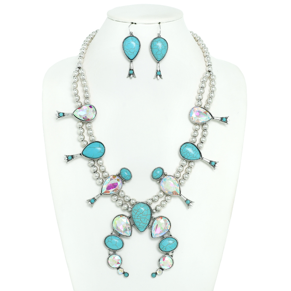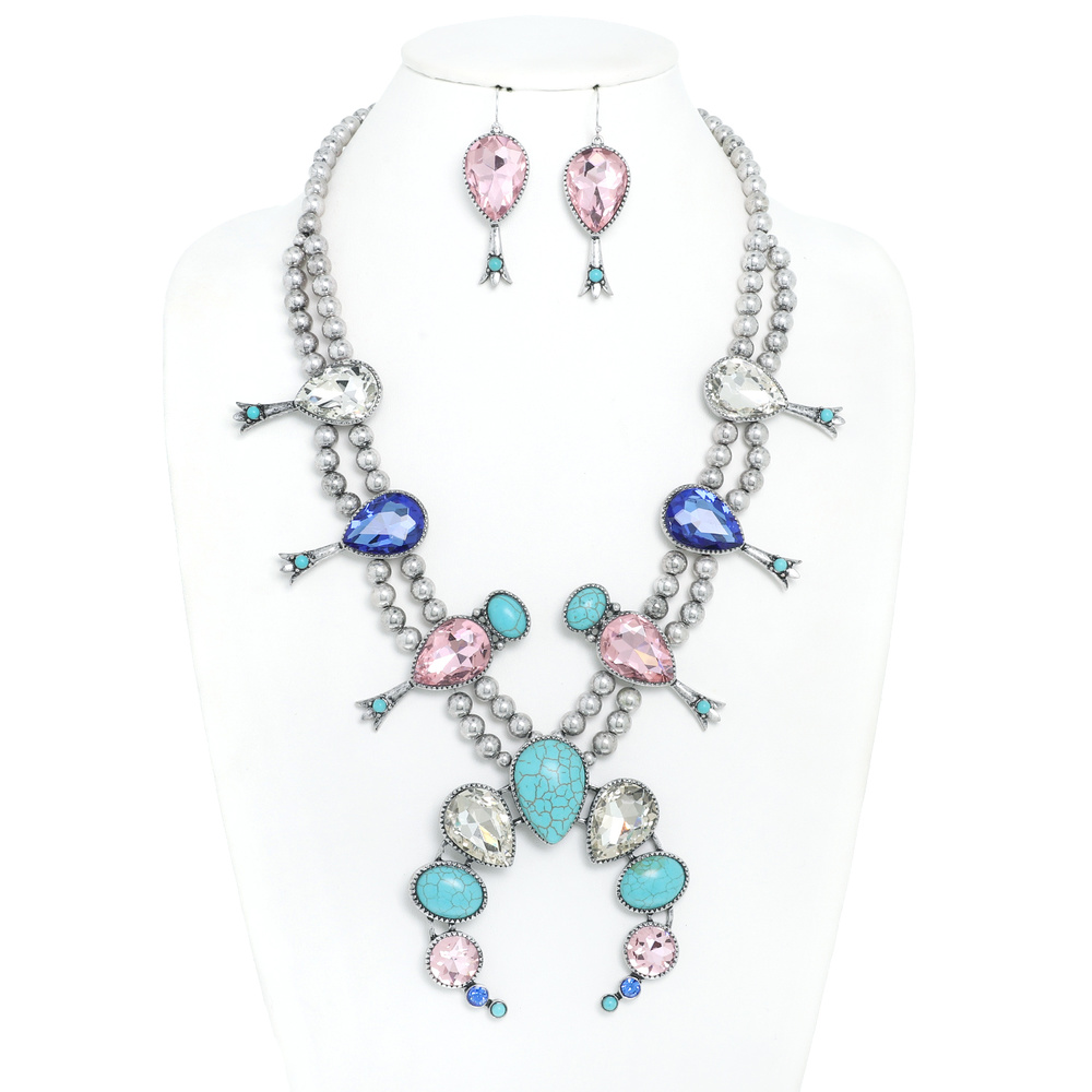 WESTERN CRYSTAL RHINESTONE SQUASH BLOSSOM ADJUSTABLE MULTI STRAND CHAIN LINK NECKLACE EARRING SET IN OXIDIZED SILVER TONE METAL