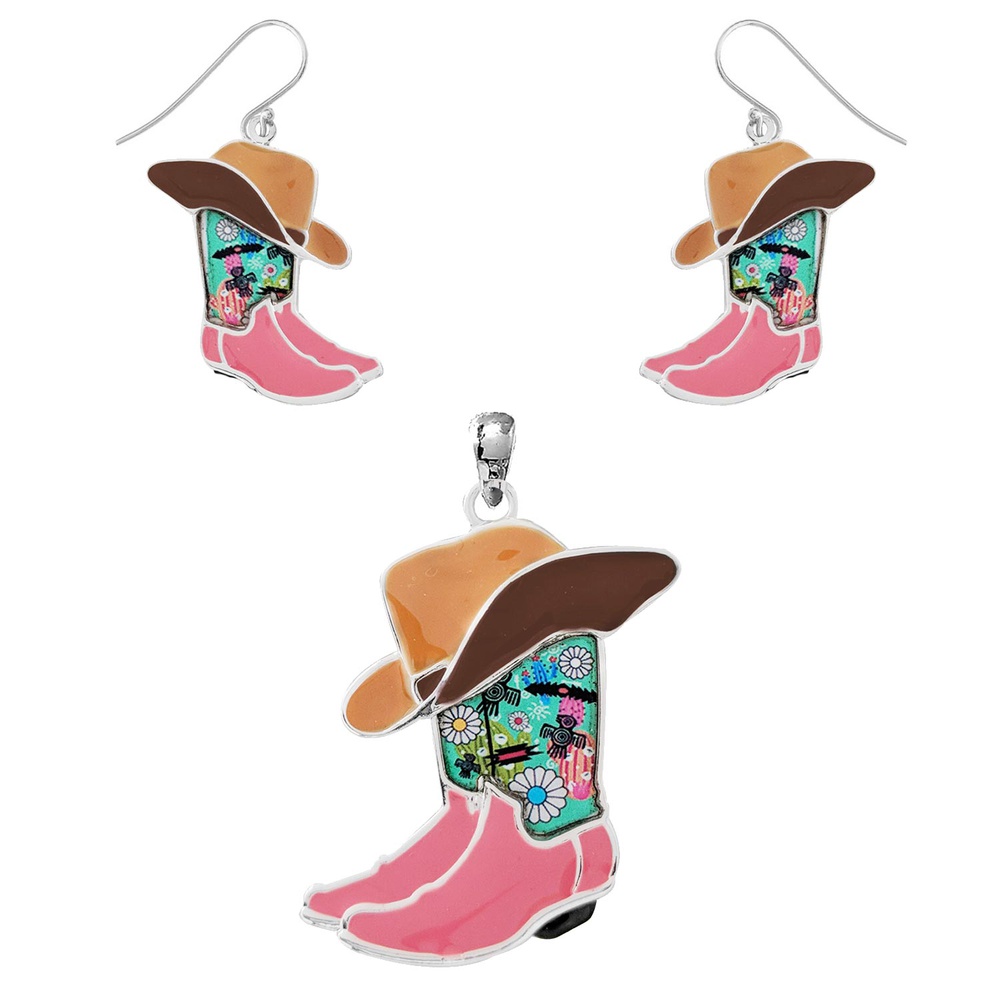 WESTERN ENAMEL COATED COWBOY BOOTS PENDANT EARRING SET IN SILVER TONE METAL ****ONLY PENDANT, NO NECKLACE INCLUDE****