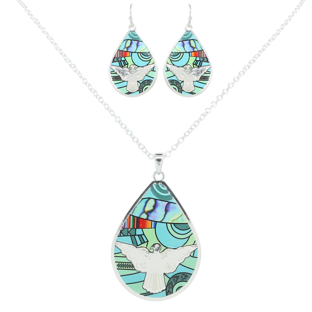 WESTERN THUNDERBIRD ENAMEL COATED TEARDROP ADJUSTABLE NECKLACE EARRING SET IN SILVER TONE METAL
