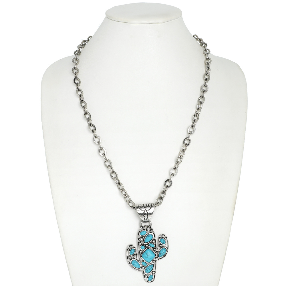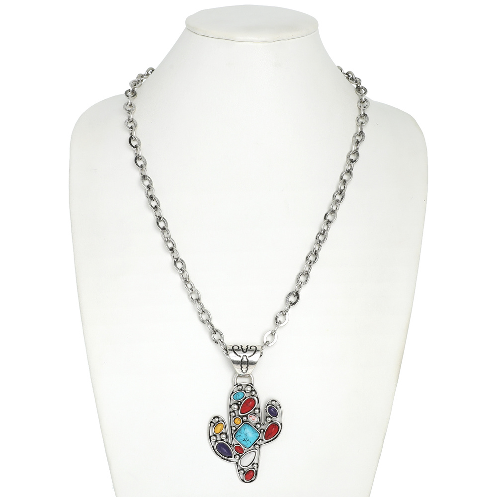 24" WESTERN MULTICOLOR TURQUOISE SEMI STONE CACTUS PENDANT CHAIN LINK NECKLACE IN OXIDIZED SILVER TONE METAL