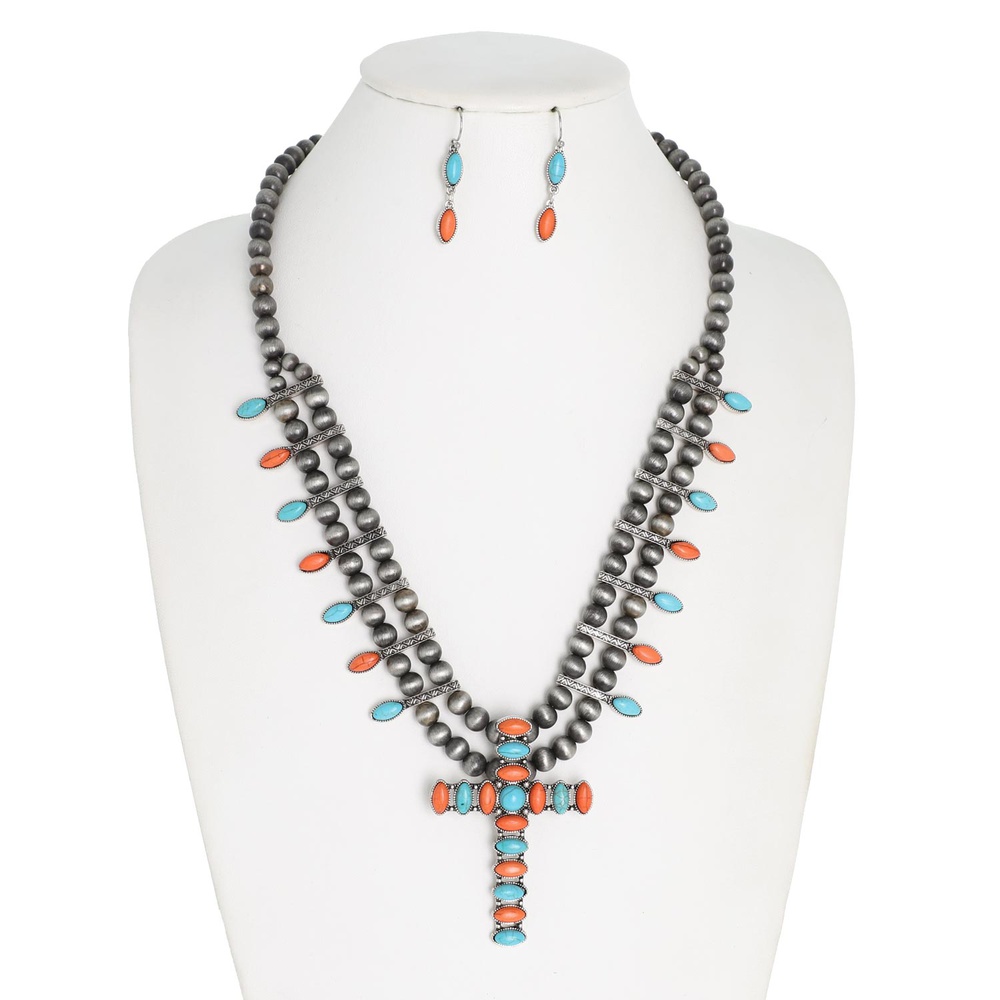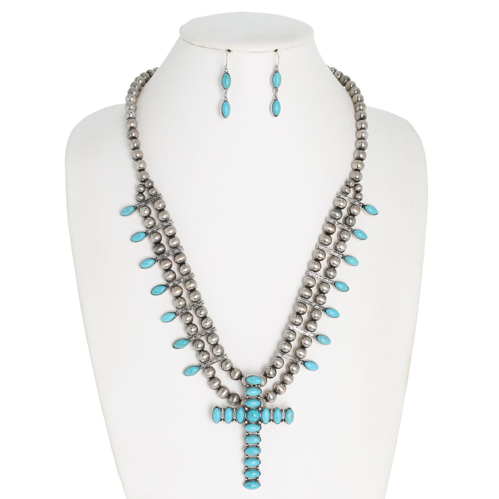24" WESTERN NAVAJO PEARL BEADED TURQUOISE SEMI STONE ADJUSTABLE CROSS PENDANT NECKLACE EARRING SET IN OXIDIZED SILVER TONE METAL