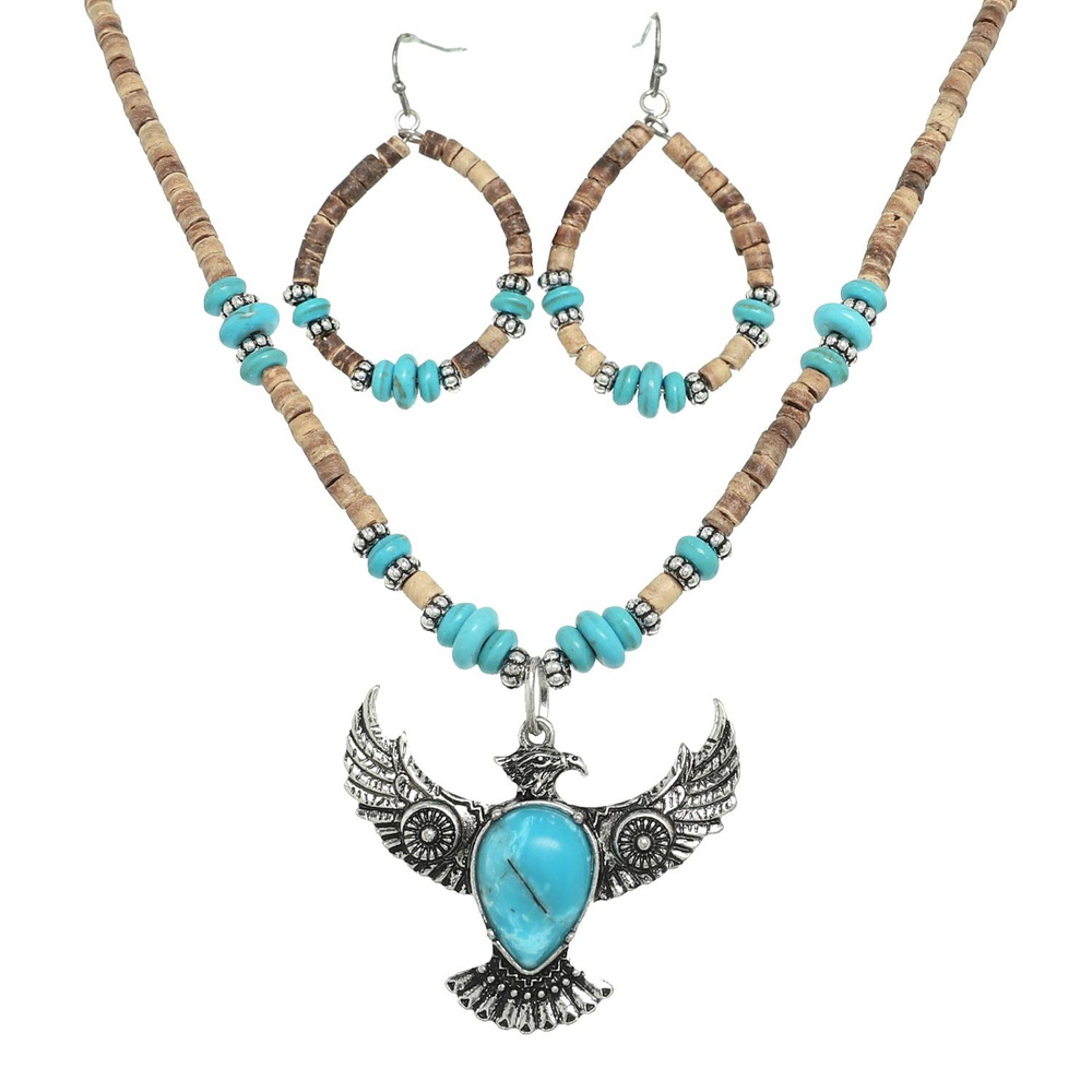 16"WESTERN TURQUOISE SEMI STONE WOOD BEAD MIX THUNDERBIRD ADJUSTABLE PENDANT NECKLACE EARRING SET IN OXIDIZED SILVER TONE METAL