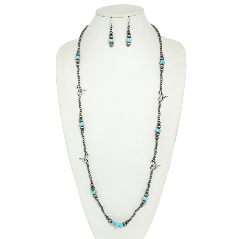 WESTERN EQUESTRIAN RODEO NAVAJO PEARL BEADED TURQUOISE SEMI STONE ADJUSTABLE LONG NECKLACE EARRING SET IN SILVER TONE OXIDIZED METAL