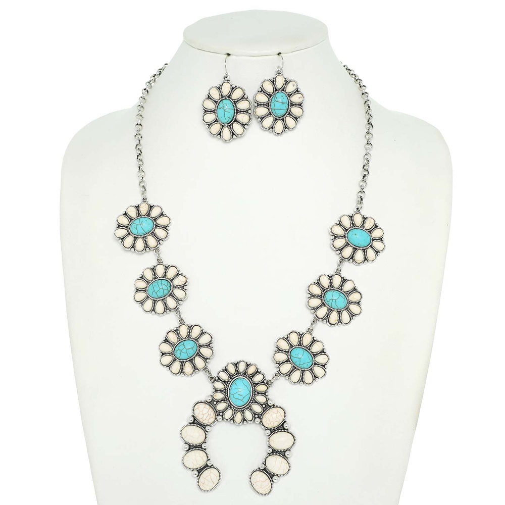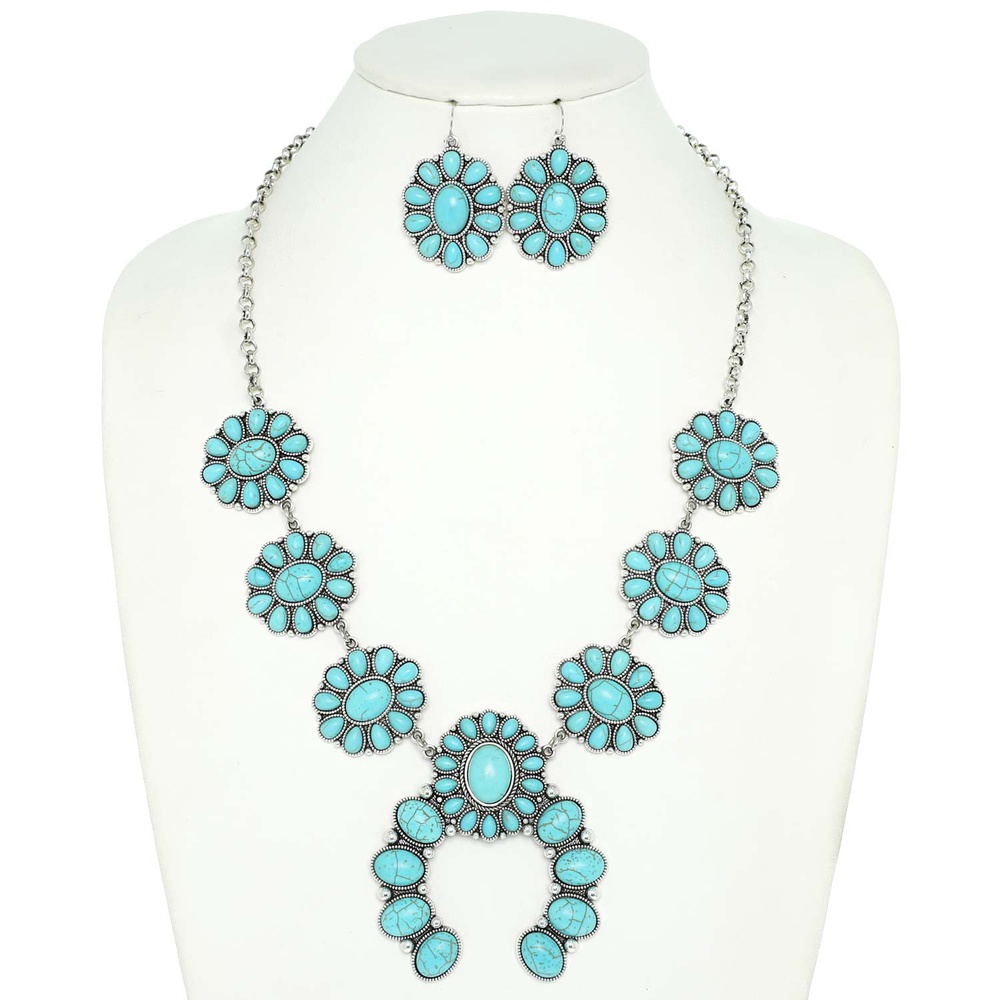 24" WESTERN TURQUOISE SEMI STONE SQUASH BLOSSOM ADJUSTABLE NECKLACE EARRING SET IN SILVER TONE OXIDIZED METAL