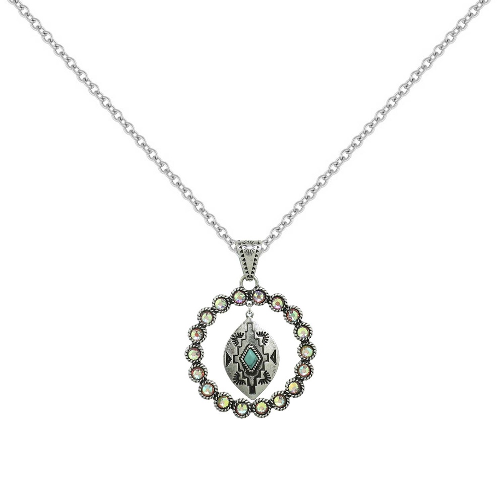 WESTERN AZTEC DESIGN OPEN CIRCLE AB CRYSTAL RHINESTONE TURQUOISE SEMI STONE ADJUSTABLE PENDANT NECKLACE IN OXIDIZED SILVER TONE METAL