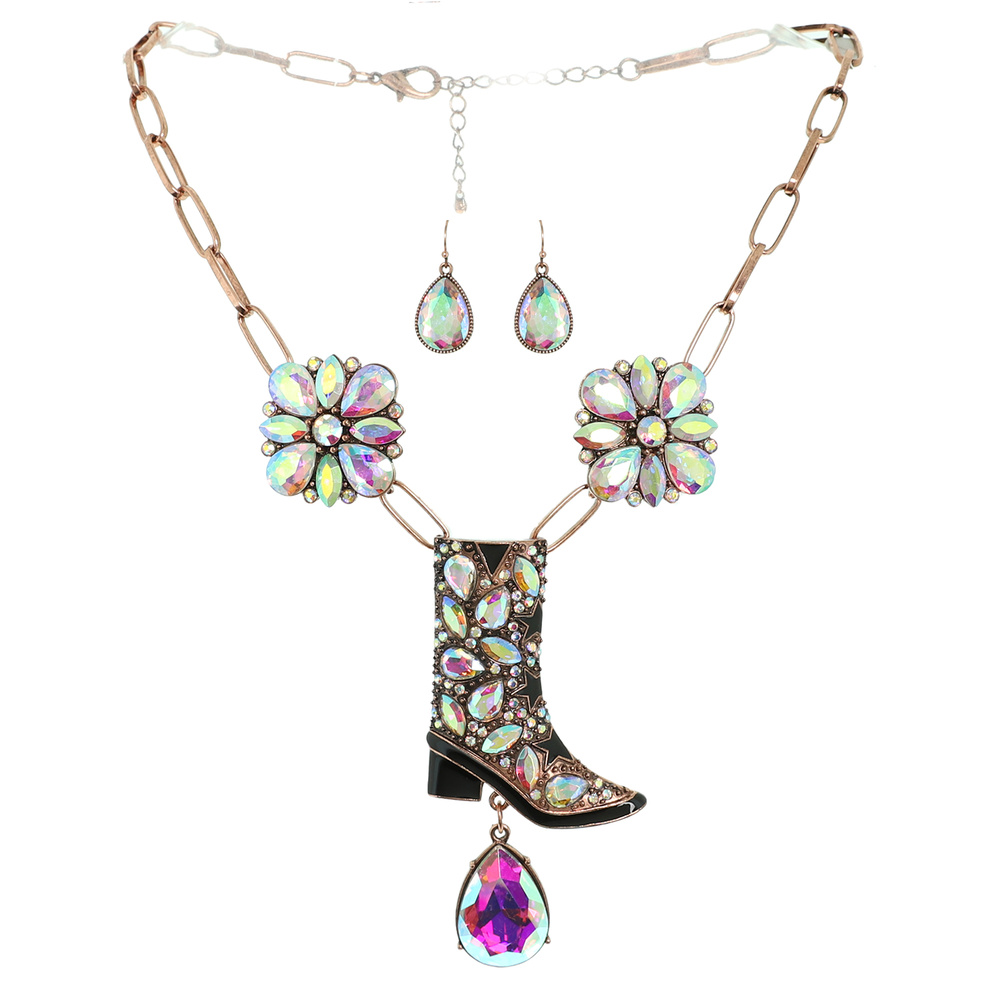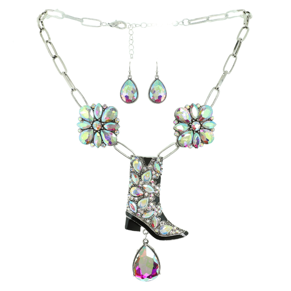 WESTERN CRYSTAL RHINESTONE COWBOY BOOT TEARDROP PENDANT NECKLACE EARRING SET