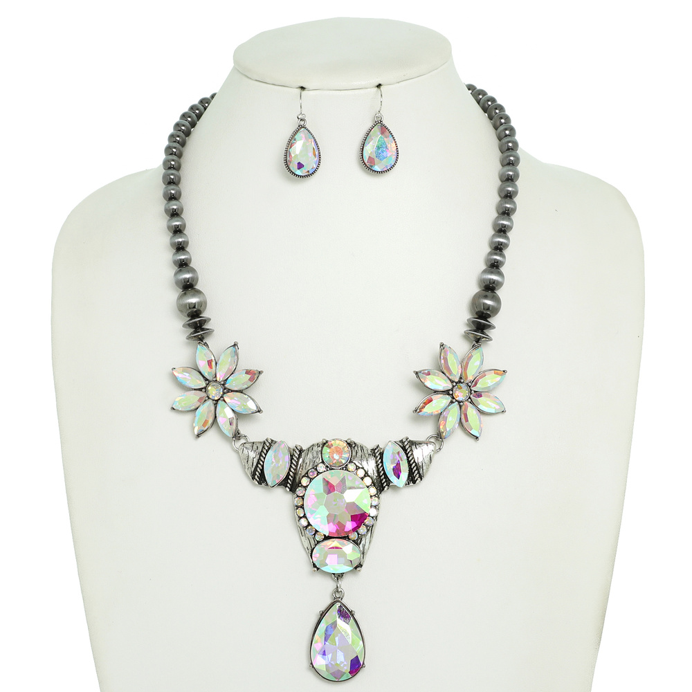 WESTERN AB CRYSTAL GEMSTONE ADJUSTABLE CATTLE HEAD NAVAJO PEARL BEADED LARIAT NECKLACE EARRING SET