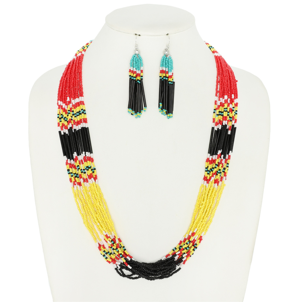 COLORFUL MULTI-STRAND BEAD NECKLACE FRINGE EARRING SET