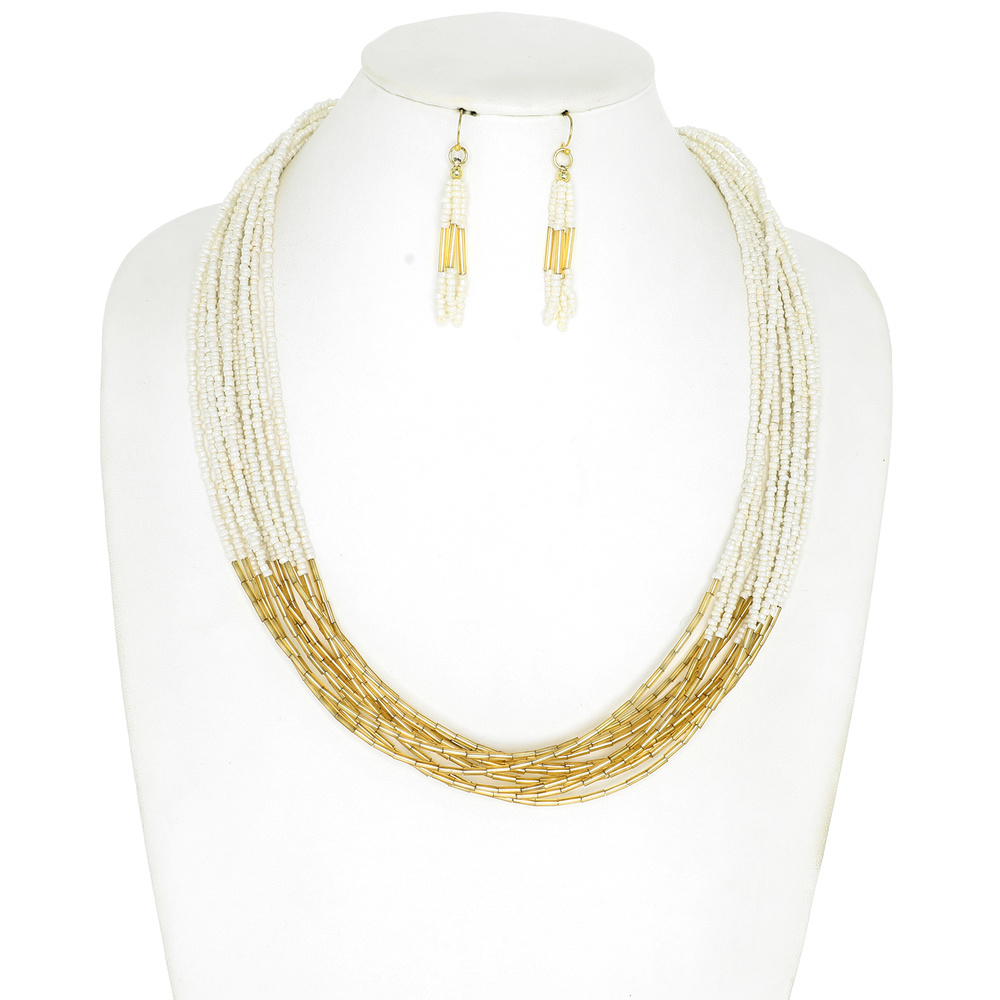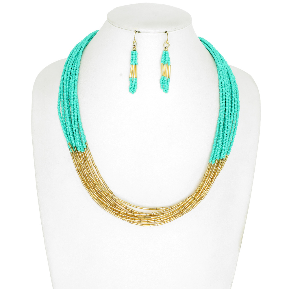 WESTERN COLORFUL TWO-TONE MULTI-STRAND BEAD NECKLACE FRINGE EARRING SET