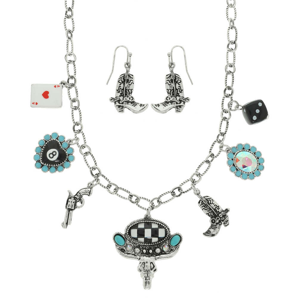 GAMBLING THEME TURQUOISE CRYSTAL EMBELLISHED MULTI-CHARM NECKLACE EARRING SET