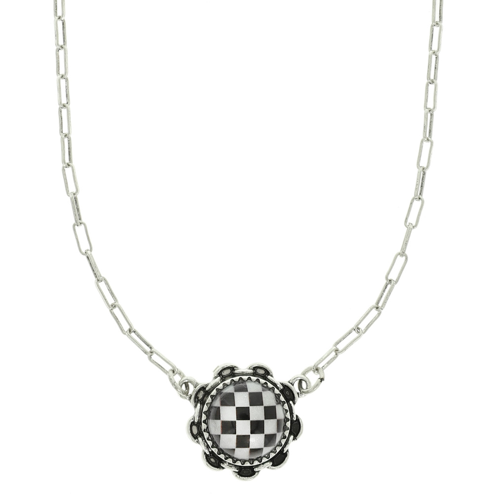 WESTERN ROUND CHECKER FLAG PATTERN PENDANT NECKLACE IN OXIDIZED SILVER-TONE METAL