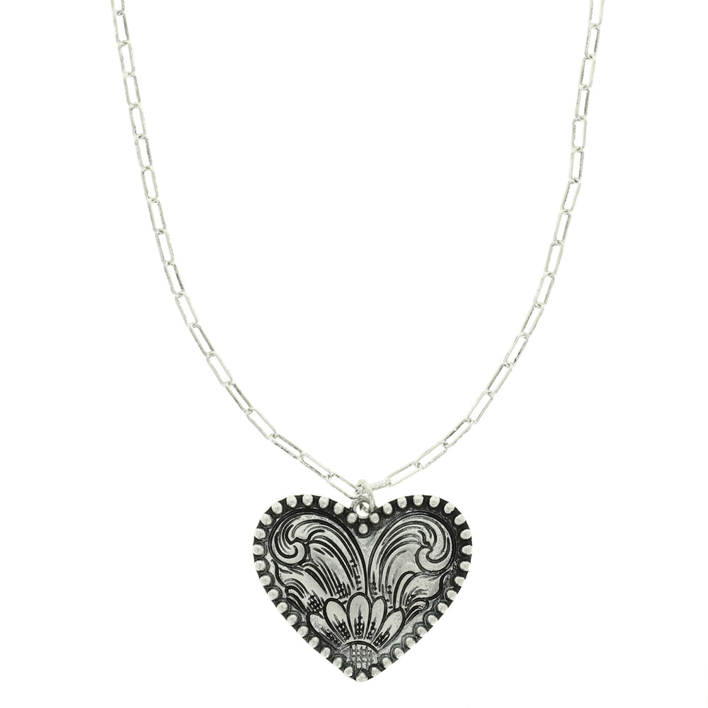 WESTERN FILIGREE ETCHED HEART PENDANT NECKLACE IN OXIDIZED SILVER-TONE METAL