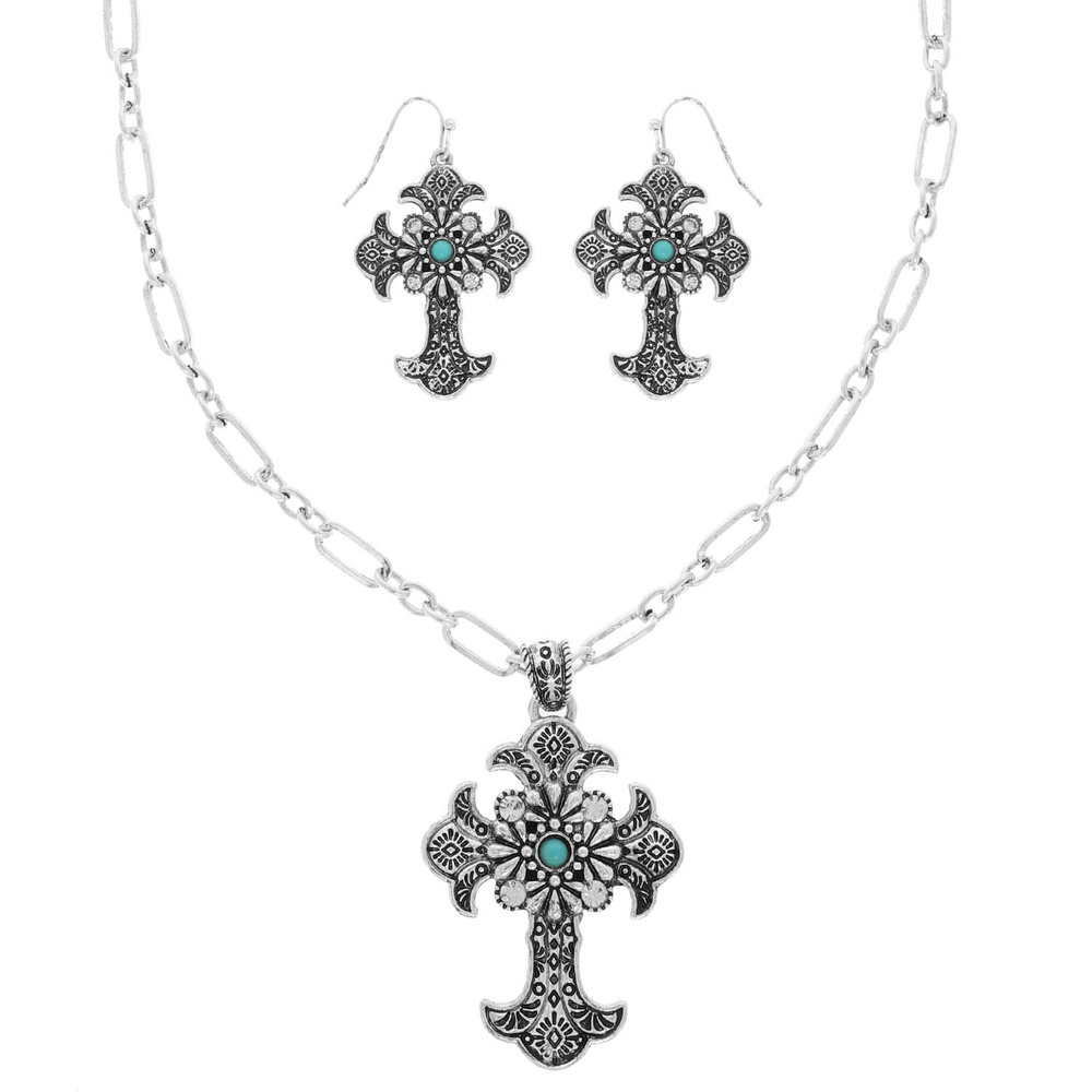 FLORAL TURQUOISE EMBELLISHED CROSS PENDANT NECKLACE EARRING SET IN GOLD TONE METAL