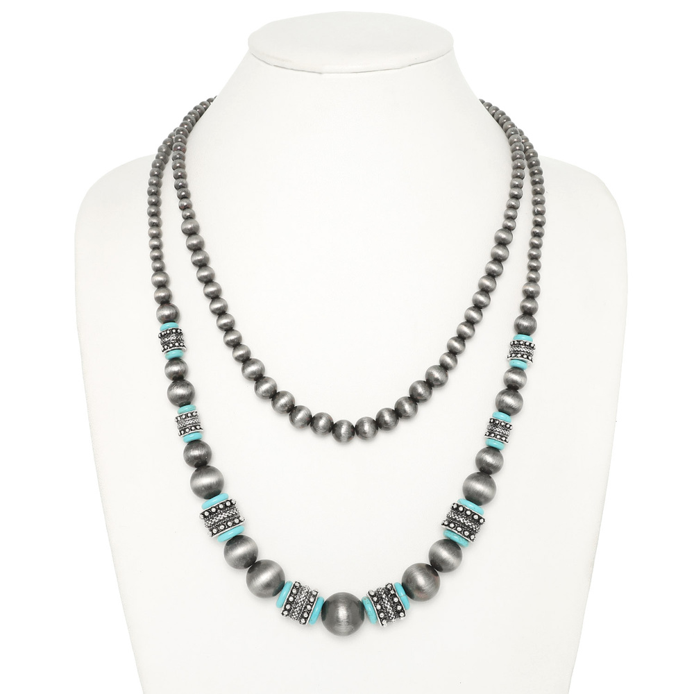 MULTI-STRAND GRADUATED BEADED NECKLACE WITH TURQUOISE AND RHINESTONE DISCS