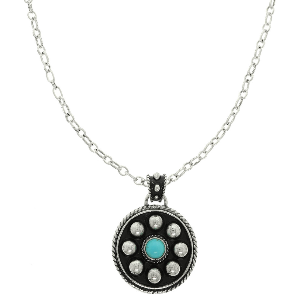 WESTERN ROUND CONCHO TURQUOISE PENDANT NECKLACE IN OXIDIZED SILVER TONE METAL