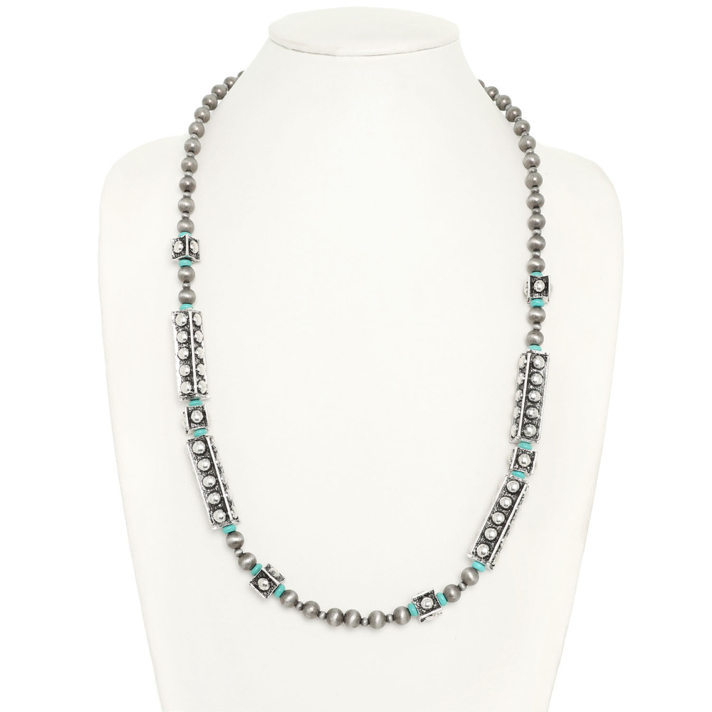 WESTERN NAVAJO BARREL BEAD NECKLACE IN OXIDIZED SILVER TONE METAL WITH TURQUOISE ACCENT BEADS