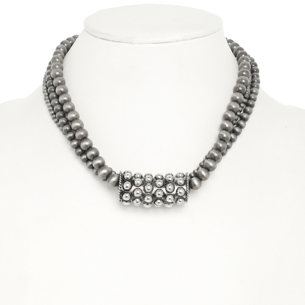 WESTERN MULTI STRAND BEADED STATEMENT NECKLACE WITH OXIDIZED SILVER TONE BARREL ACCENT
