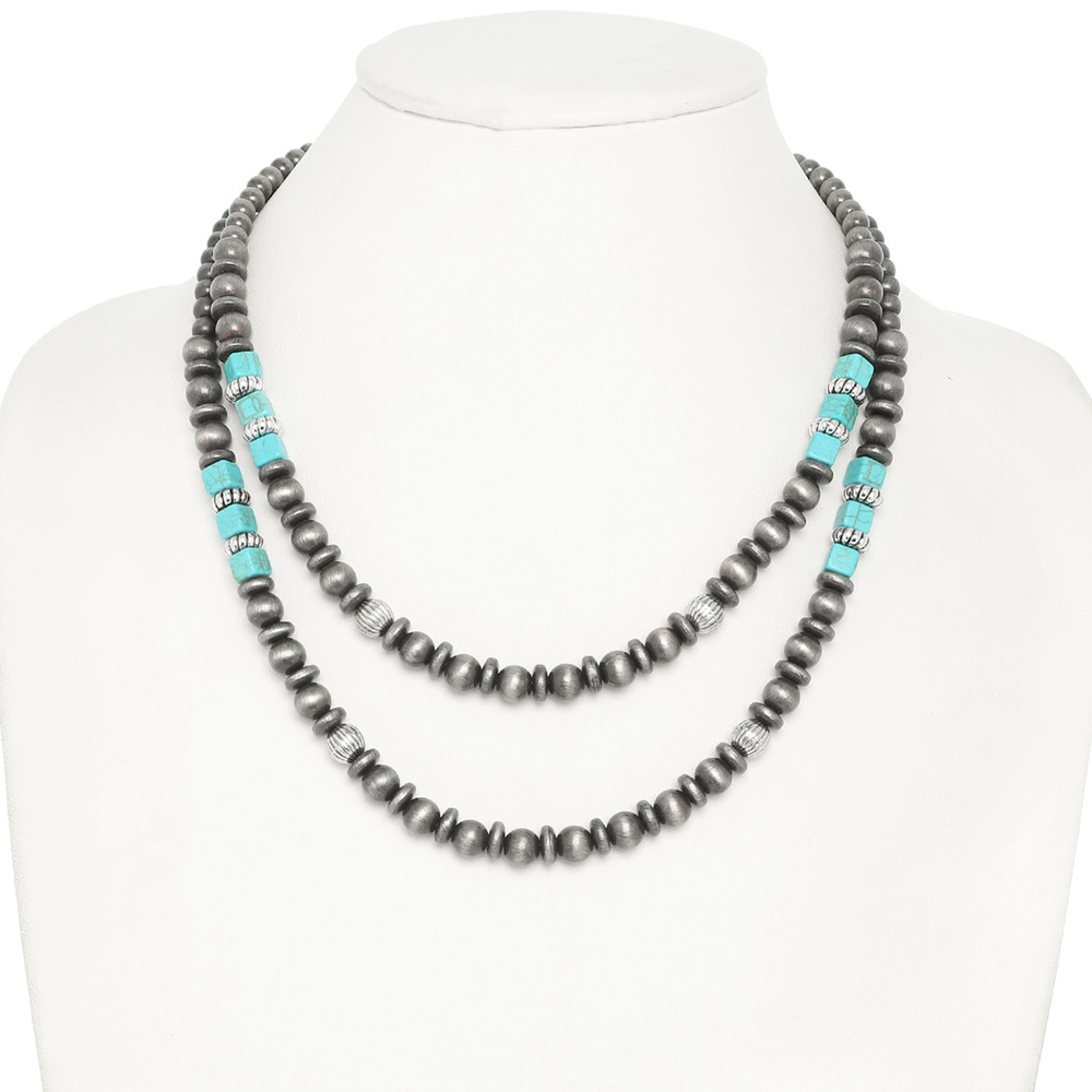 WESTERN MULTI STRAND BEEDED NECKLACE WITH TURQUOISE ACCENT BEADS AND SILVER TONE BEADS