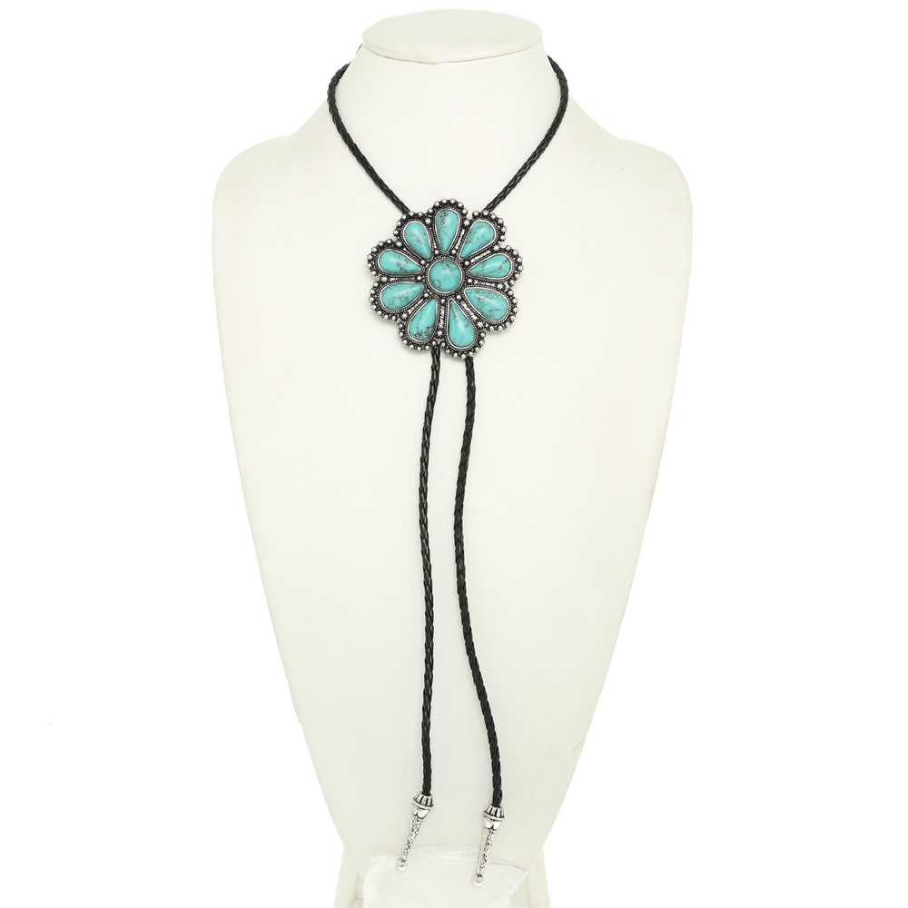 WESTERN FLORAL TURQUOISE BOLO NECKLACE WITH BRAIDED CORD