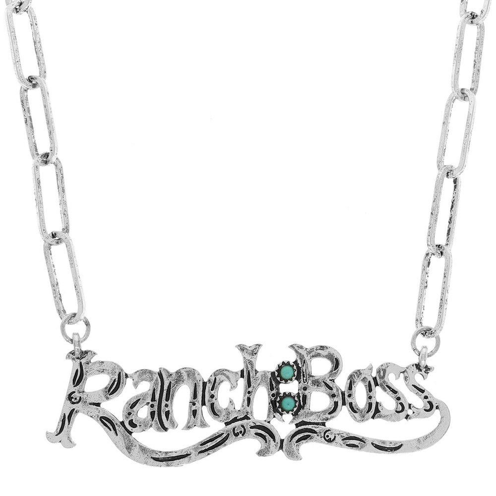 WESTERN RANCH BOSS WORD PENDANT NECKLACE WITH TURQUOISE ACCENTS IN OXIDIZED SILVER TONE METAL