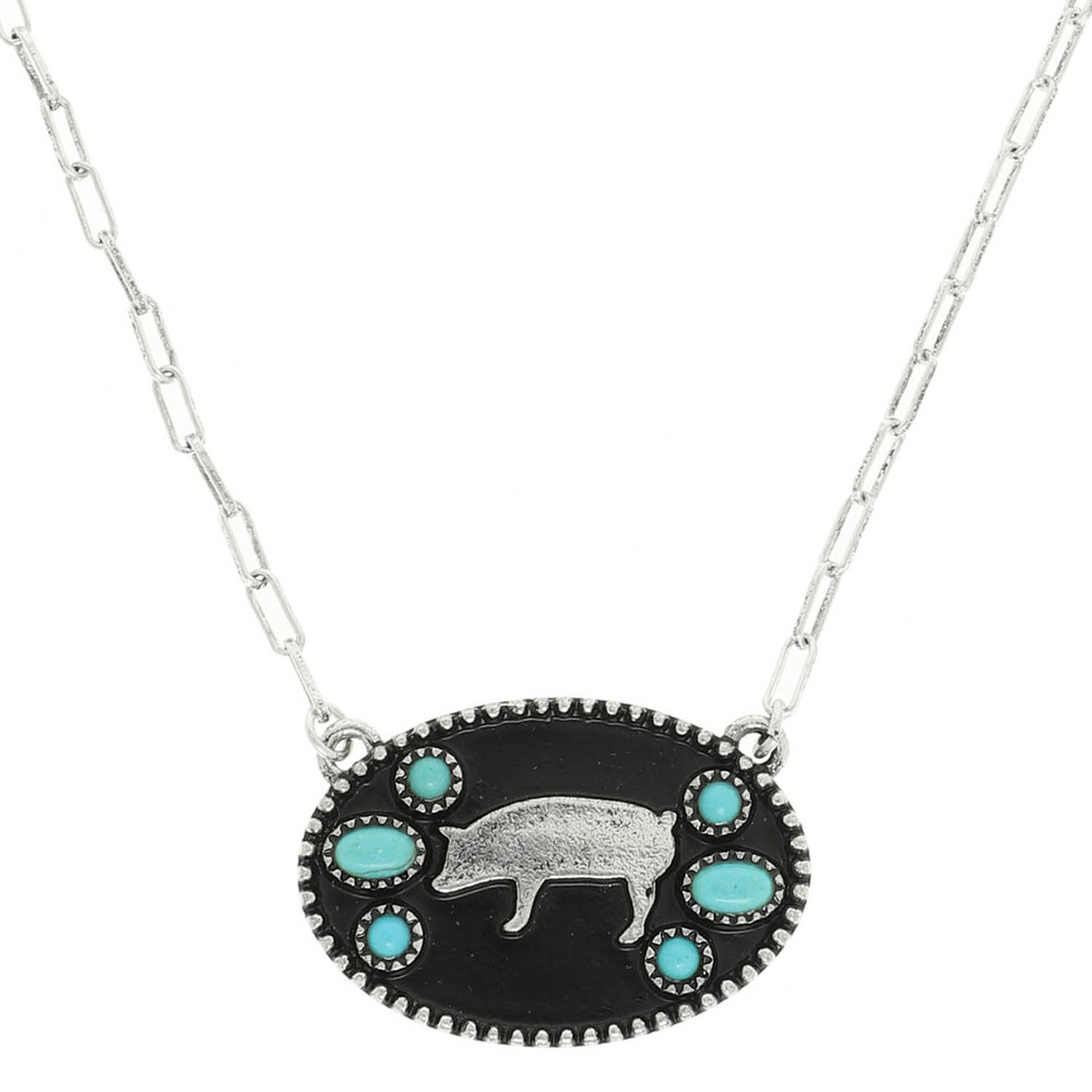WESTERN PIG TURQUOISE PENDANT NECKLACE IN OXIDIZED SILVER TONE METAL