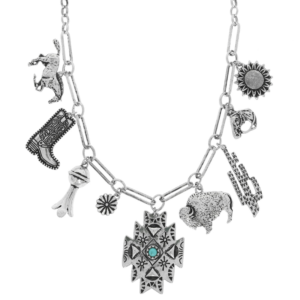 MULTI CHARM NECKLACE WITH BOOT HORSE CACTUS BISON AND TURQUOISE ACCENT PENDANT