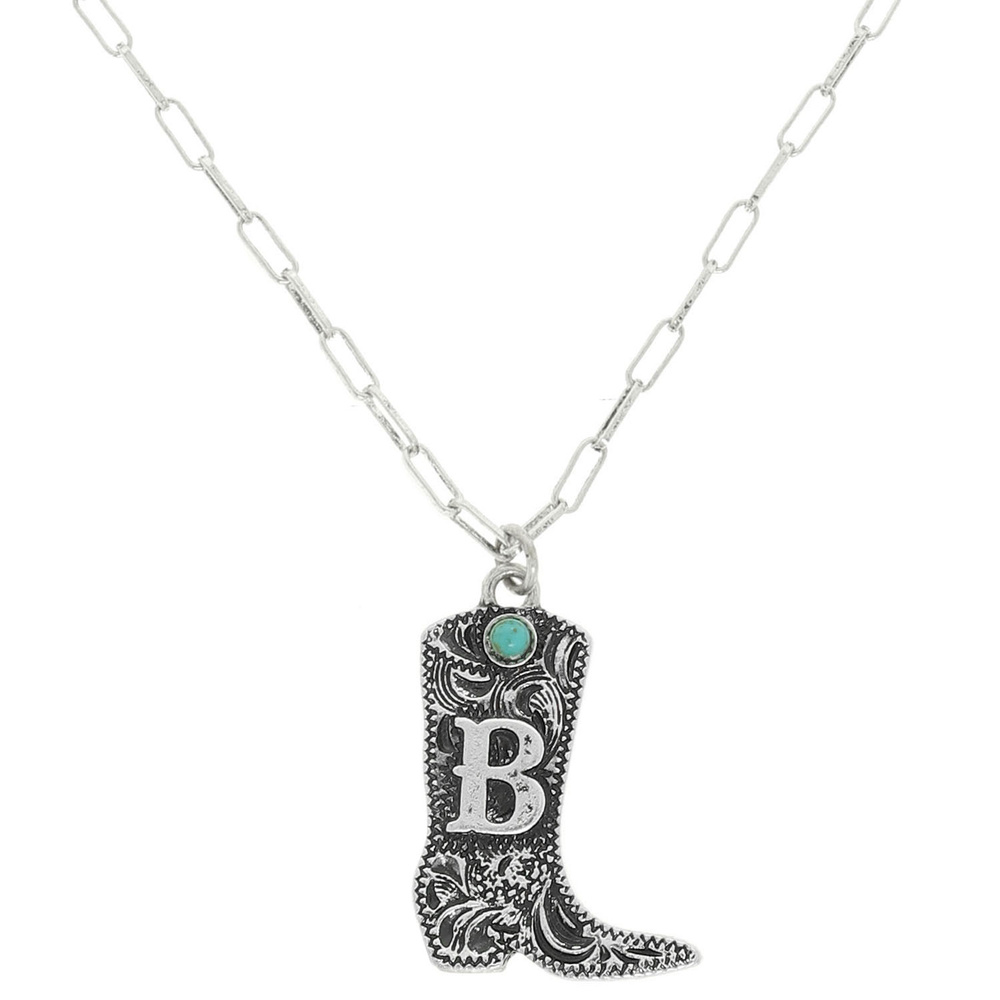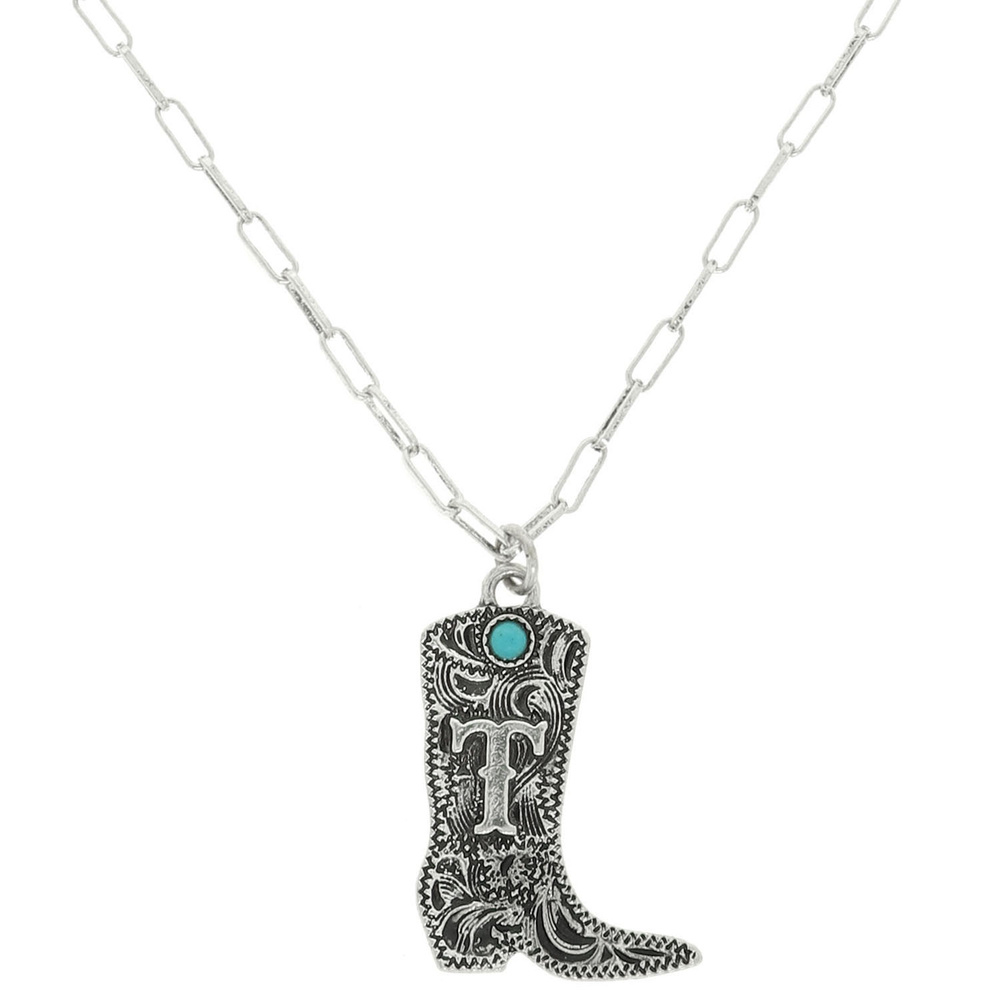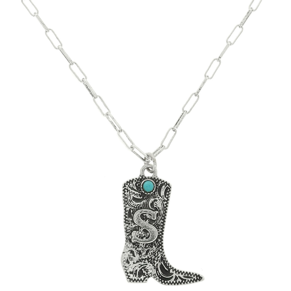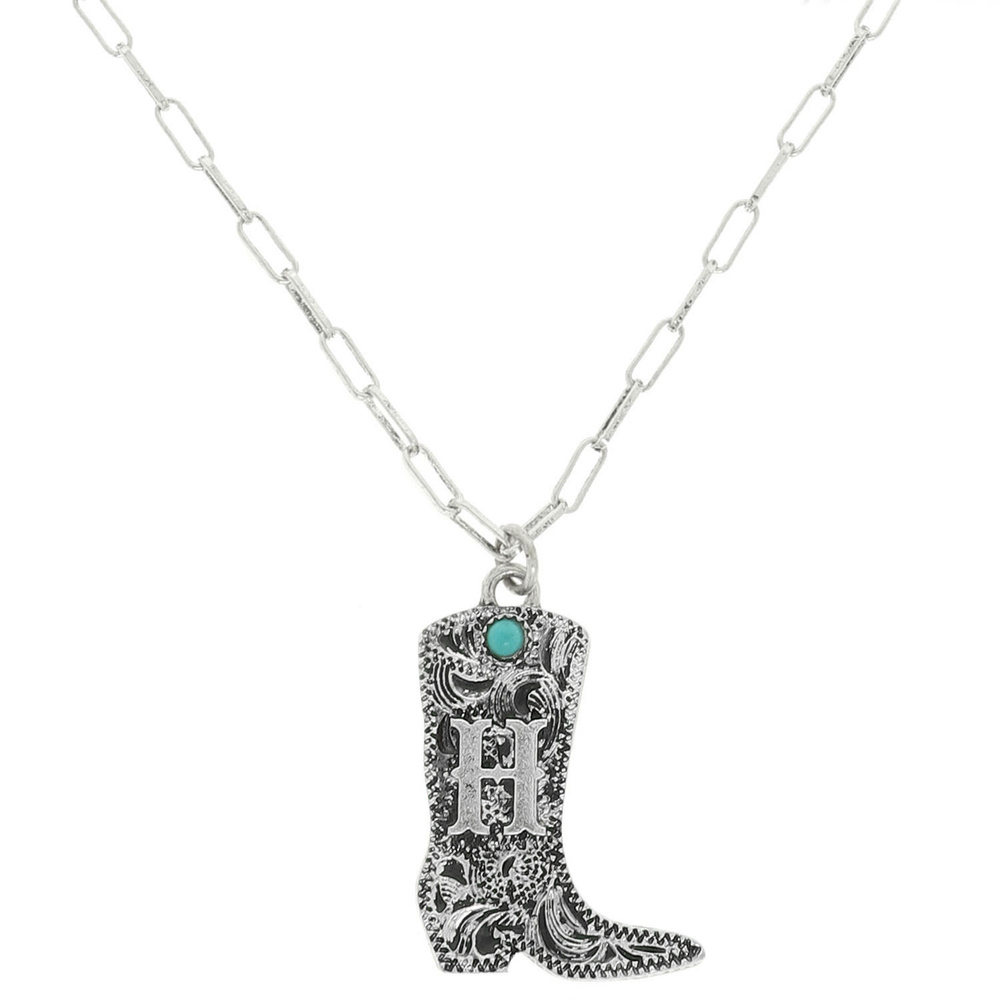 WESTERN COWBOY BOOT INITIAL PENDANT NECKLACE WITH TURQUOISE ACCENT
