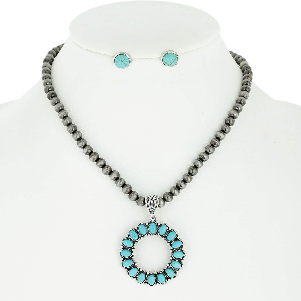 WESTERN TURQUOISE CIRCLE PENDANT NAVAJO PEARL NECKLACE AND EARRINGS SET