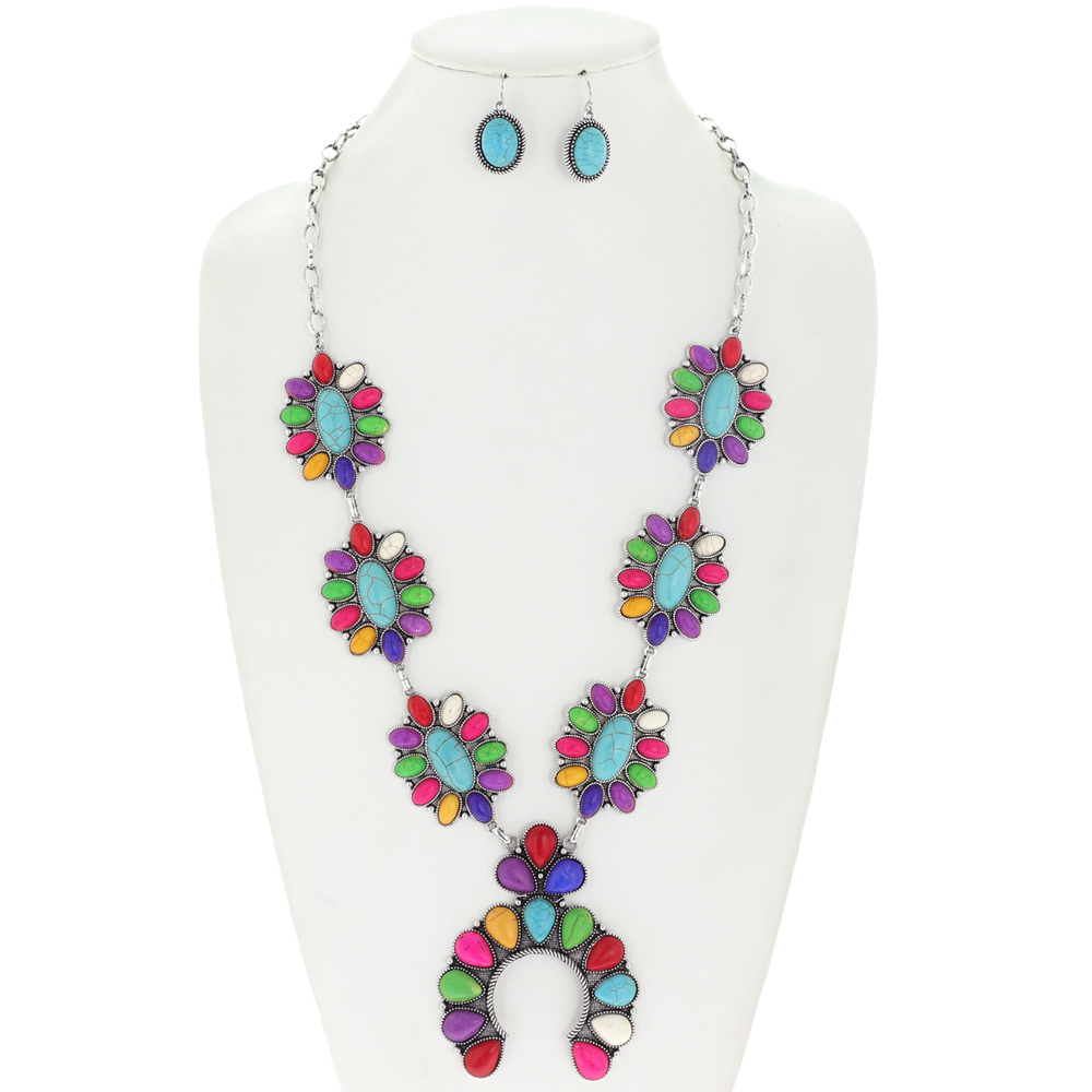 WESTERN STATEMENT SQUASH BLOSSOM TURQUOISE NECKLACE AND EARRINGS SET