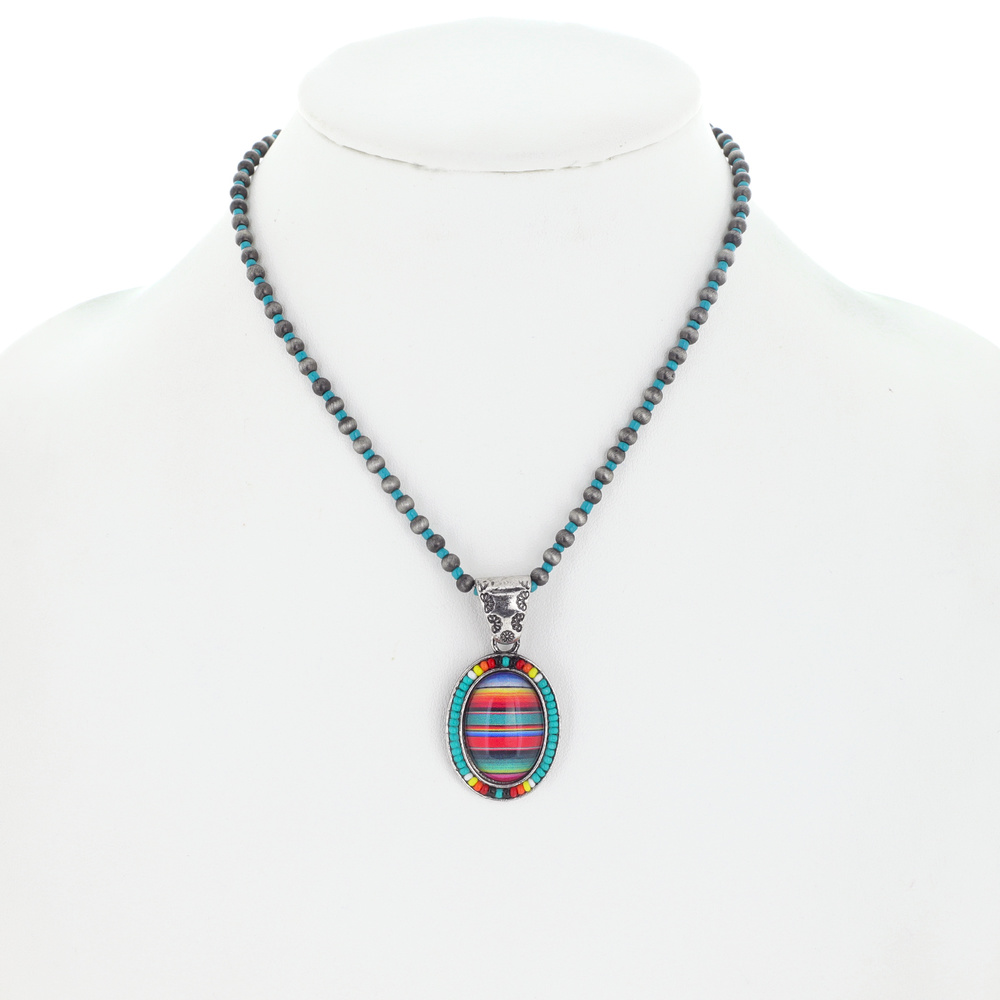Navajo Pearl Serape Seed Bead Oval Pendant Necklace - Western Native American Ethnic Boho Jewelry