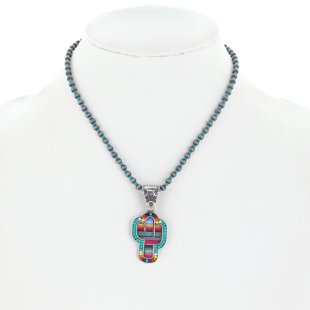Navajo Pearl Serape Seed Bead Cactus Pendant Necklace - Western Native American Ethnic Boho Jewelry