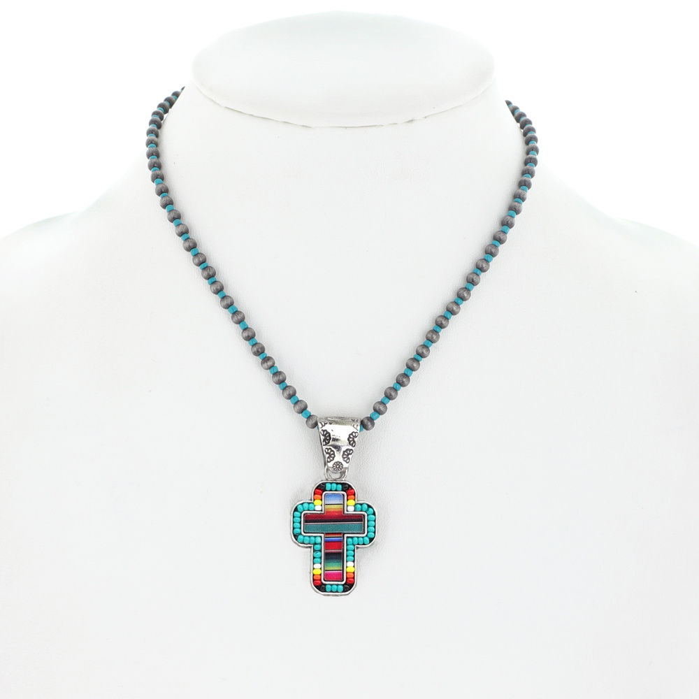 Navajo Pearl Serape Seed Bead Cross Pendant Necklace - Western Native American Ethnic Boho Jewelry