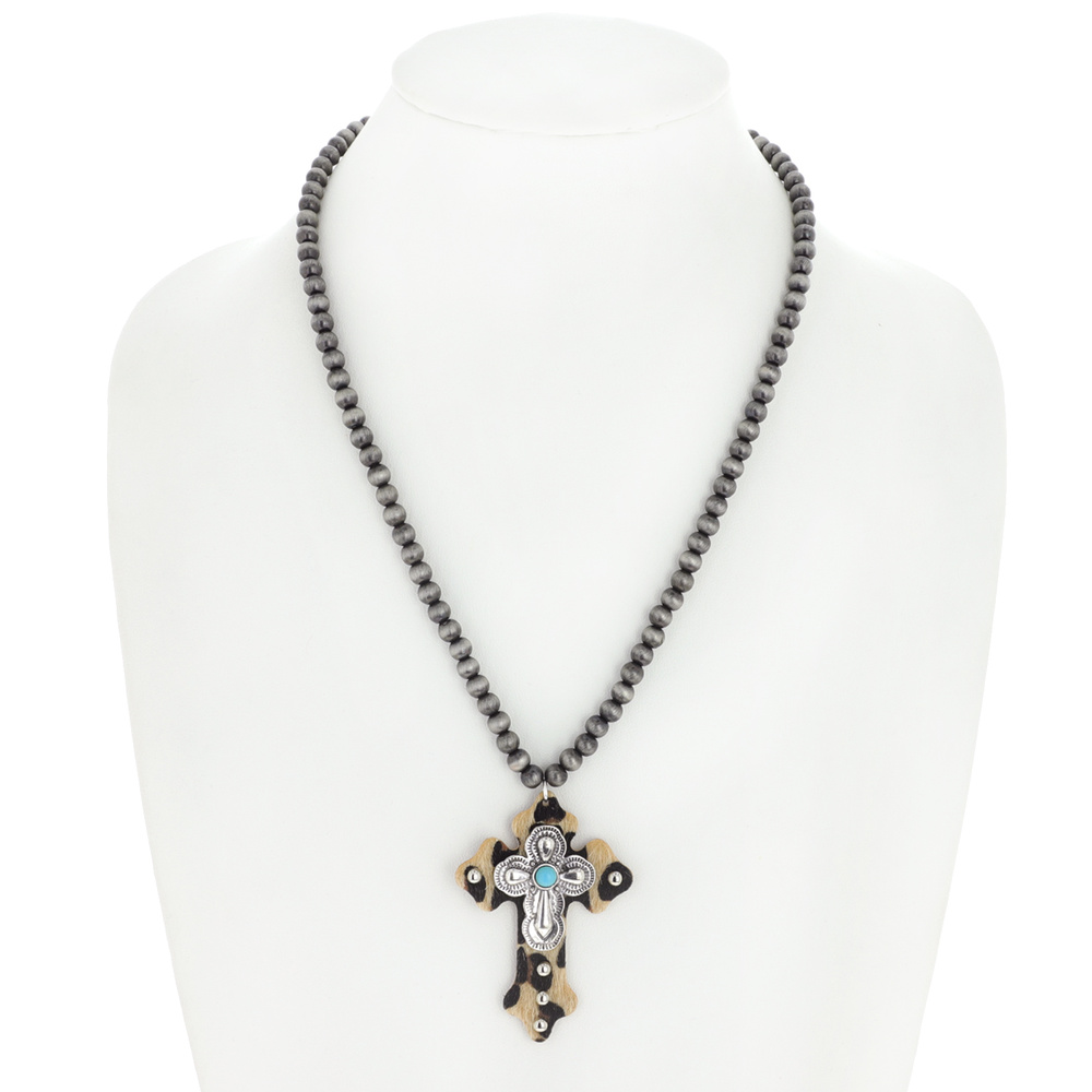 Western Navajo Perl Turquoise Leopard Printed Cross Pendant Necklace