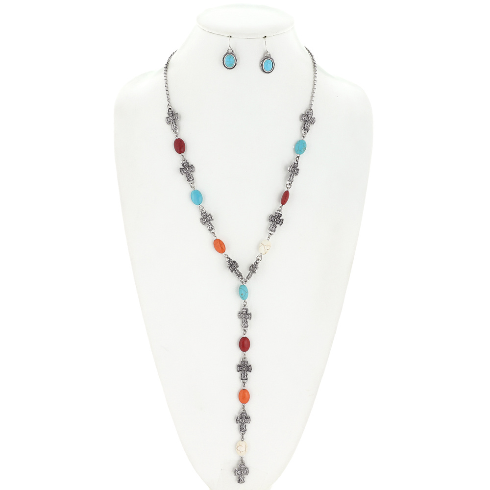 WESTERN STYLE CROSS MULTI STONE LARIAT Y ADJUSTABLE NECKLACE EARRING SET