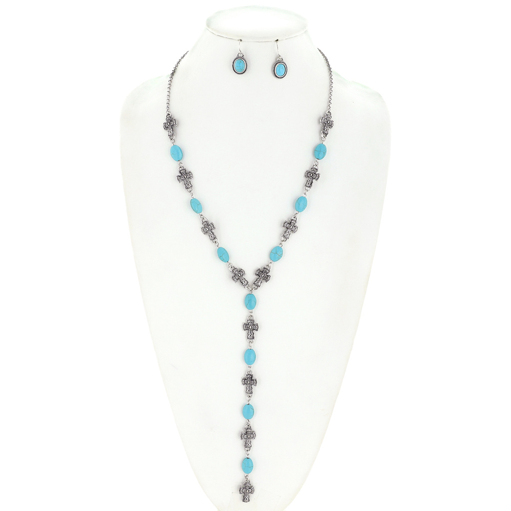 Western Style Cross Multi Stone Lariat Y Adjustable Necklace Earring Set