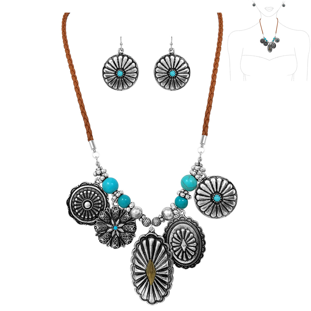 WESTERN CONCHO CHARMS MULTI BEAD SUEDE NECKLACE EARRING SET