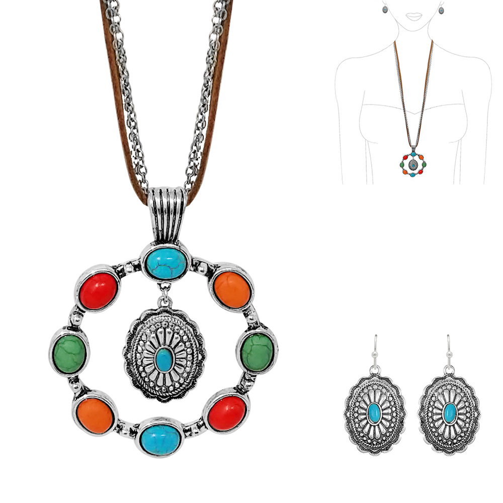 CIRCULAR TURQUOISE OPEN CONCHO CHARM PENDANT CHAIN SUEDE NECKLACE AND EARRING SET