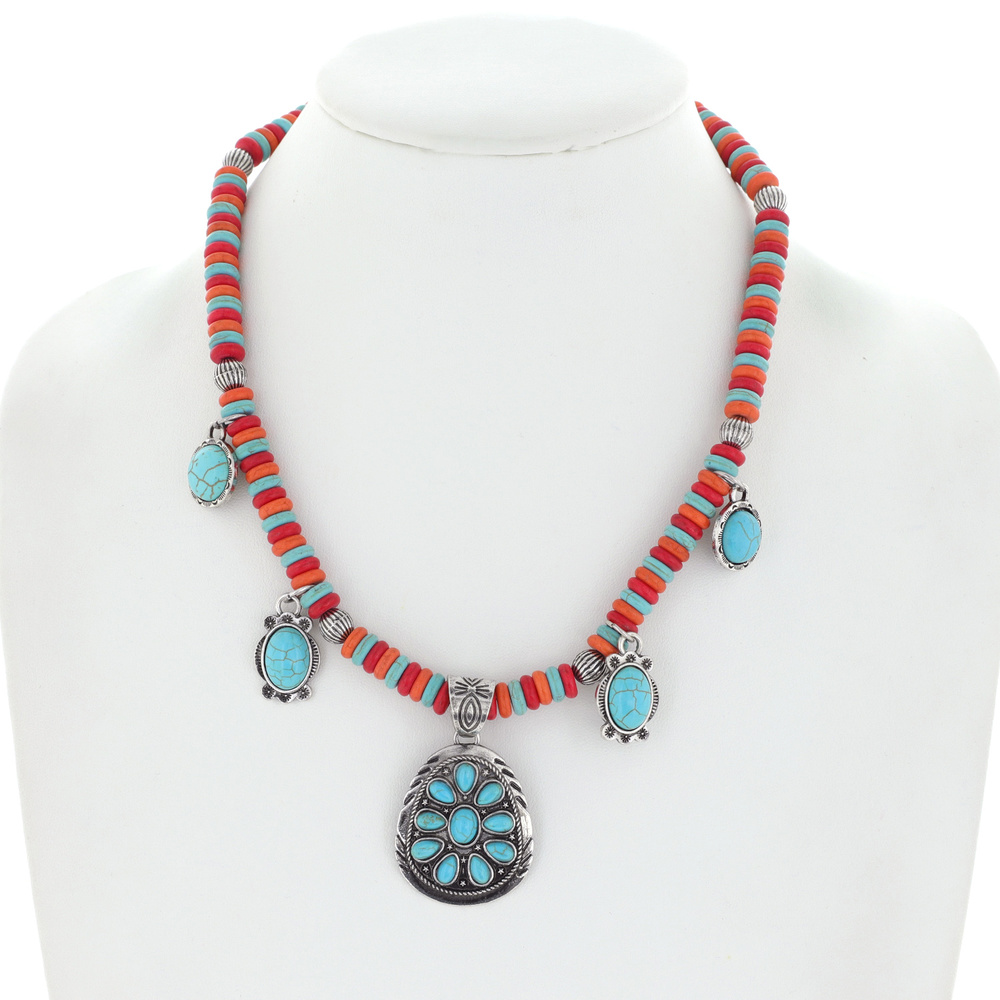 WESTERN CONCHO TURQUOISE CLUSTER BEAD MIX CHARM PENDANT NECKLACE
