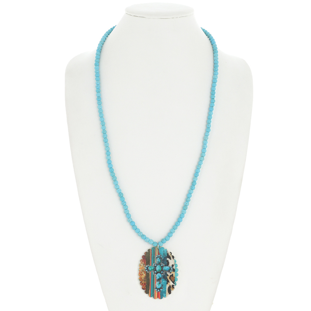 CROSS WESTERN PRINT WOODEN HOWLITE BEADED NECKLACE