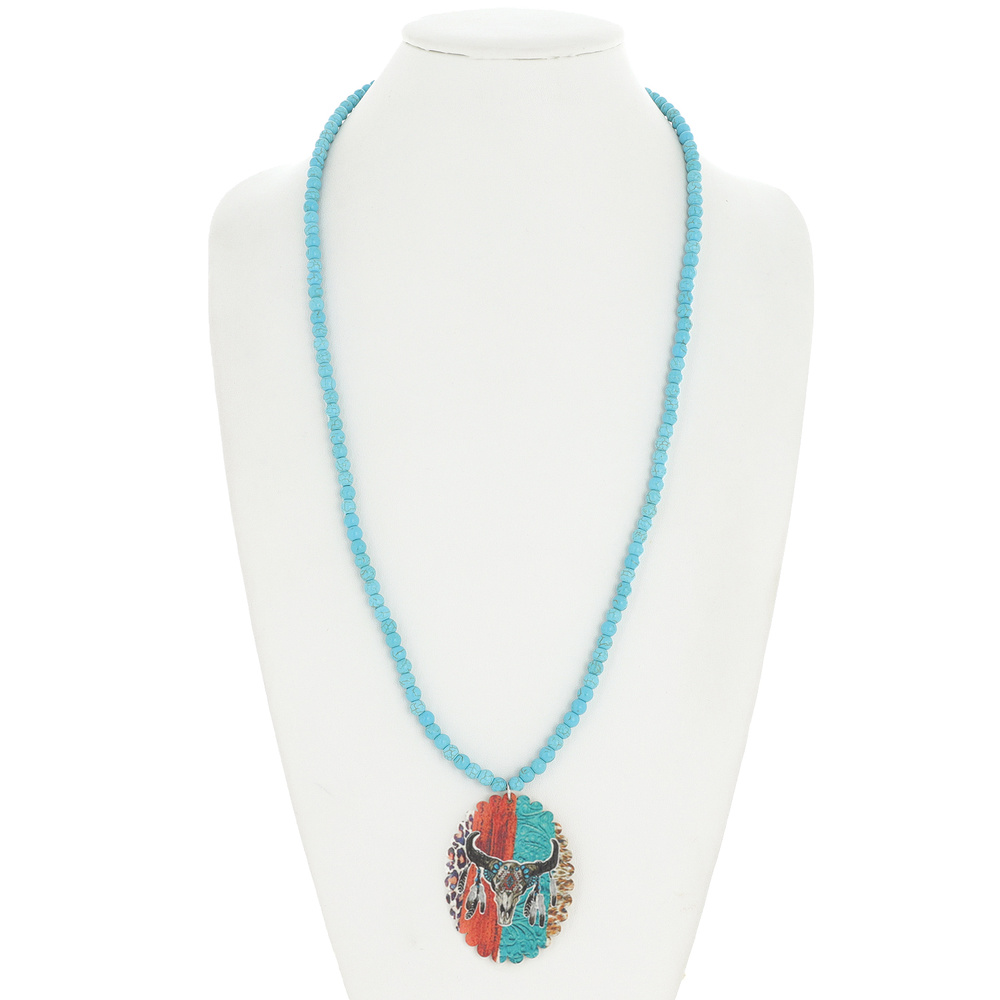STEER WESTERN PRINT WOODEN HOWLITE BEADED NECKLACE - HEALING ENERGY JEWELRY