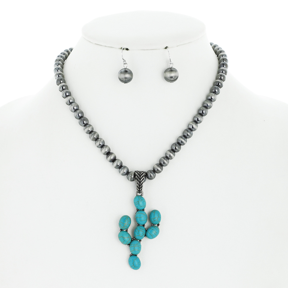 WESTERN STYLE SEMI STONE CACTUS NAVAJO PEARL BEADED ADJUSTABLE NECKLACE EARRING SET IN SILVER TONE METAL