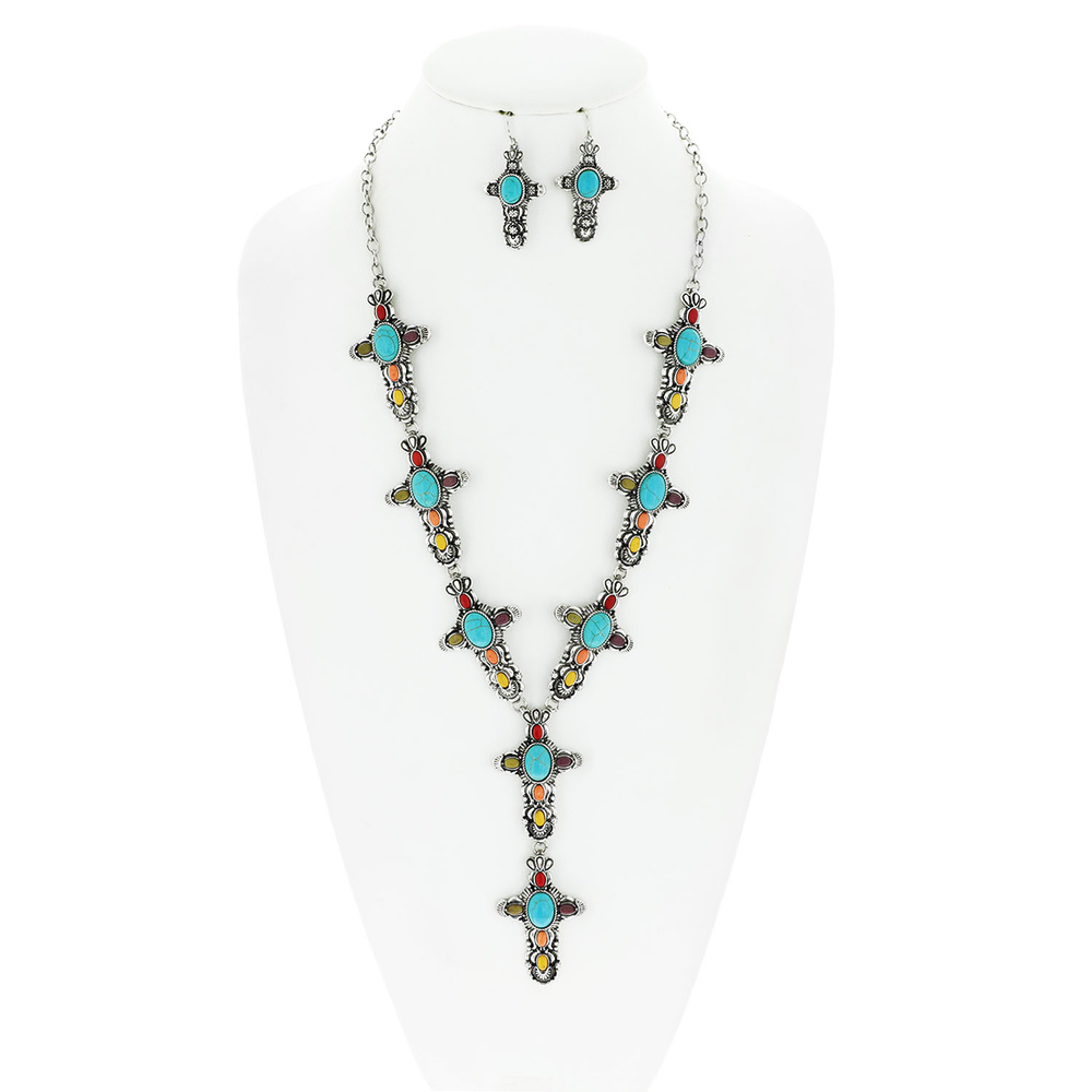 VINTAGE WESTERN STYLE SEMI-STONE TURQUOISE CROSS LARIAT ADJUSTABLE NECKLACE EARRING SET