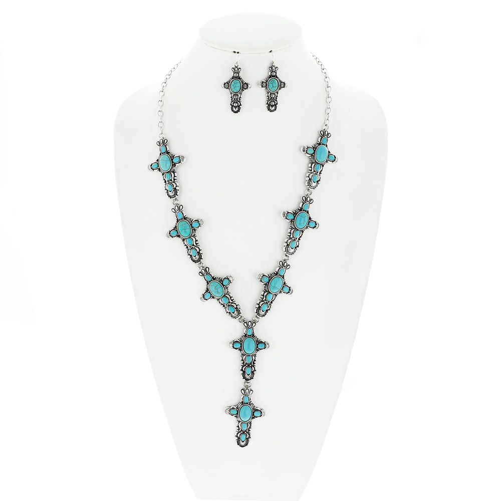 Vintage Western Style Semi-stone Turquoise Cross Lariat Adjustable Necklace Earring Set