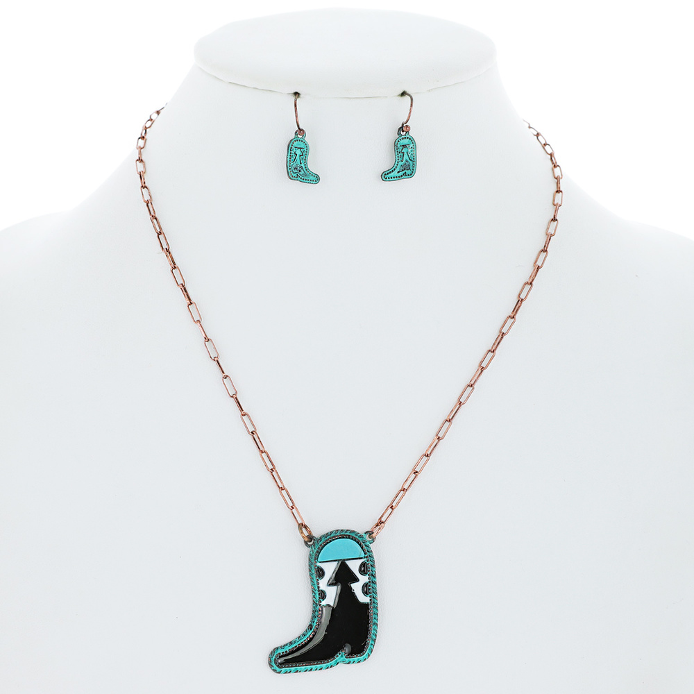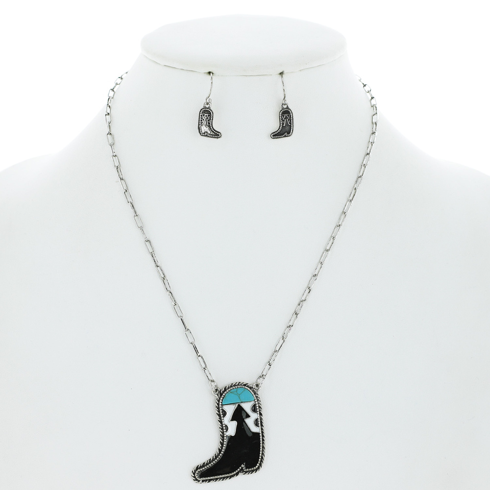 VINTAGE WESTERN ENAMEL COATED SYNTHETIC SEMI STONE COWBOY BOOT CHAIN NECKLACE EARRING SET