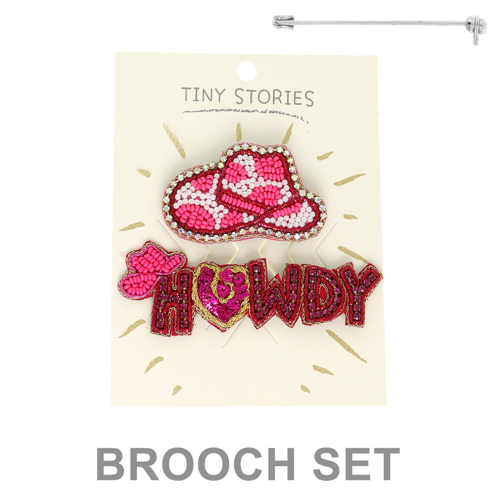 2 PIECE WESTERN RHINESTONE BEAD EMBELLISHED "HOWDY" AND COWBOY HAT BROOCH PIN SET