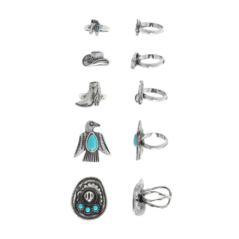 5-PACK ASSORTED WESTERN THEMED TURQUOISE SEMI STONE CUFF RING SET
