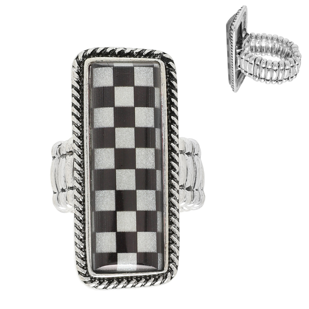 EPOXY CHECKER PATTEREN BAR STRETCH RING IN OXIDIZED SILVER-TONE METAL