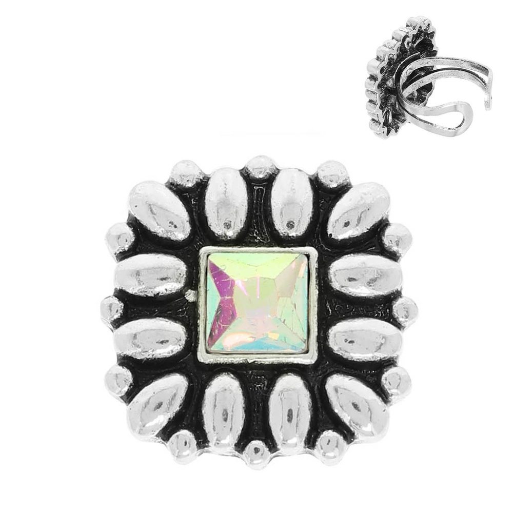 FLORAL SQUARE CONCHO STRETCH RING WITH CRYSTAL IN OXIDIZED SILVER TONE METAL