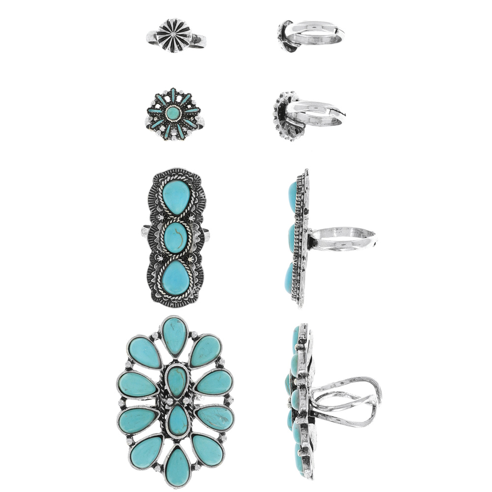 4-piece Set - Vintage Western Style Turquoise Stone Rings In Silver Tone Oxidized Metal